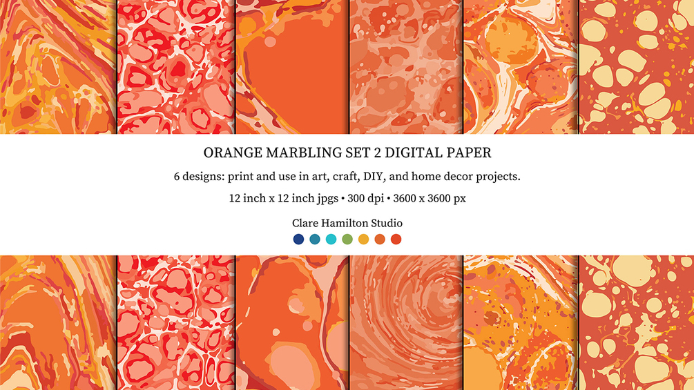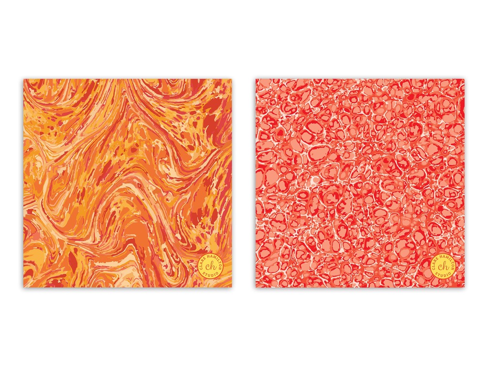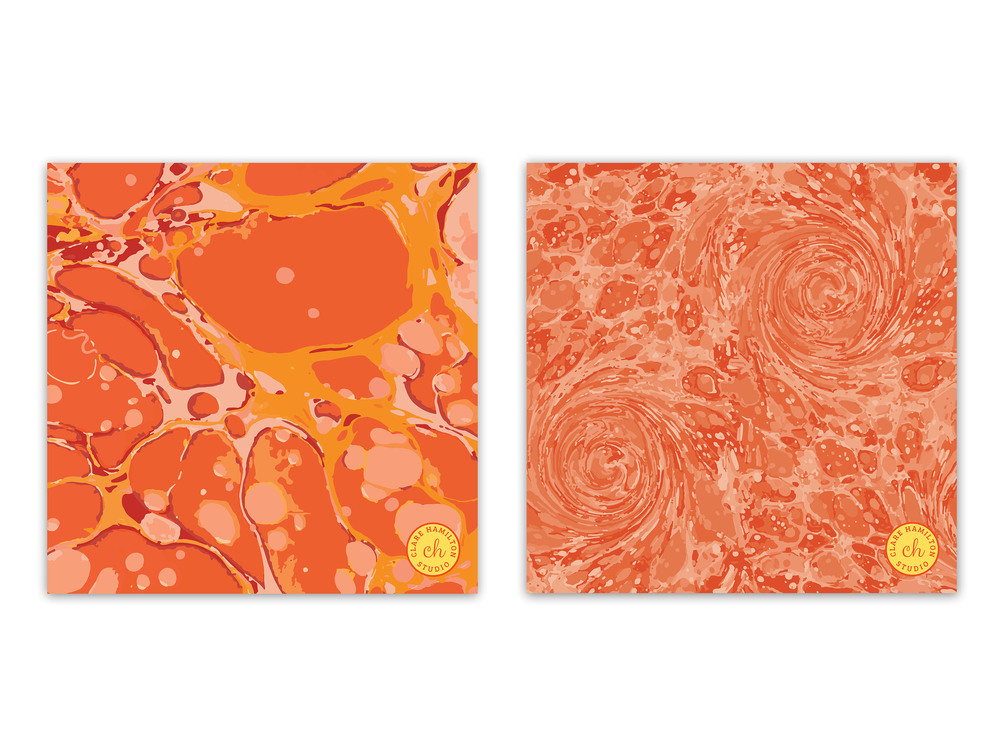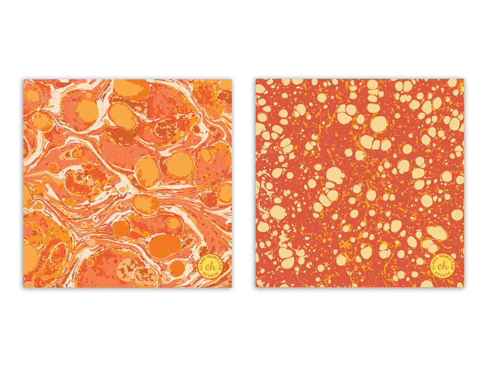 6 orange-toned modern marbling designs, inspired by antique book endpapers.