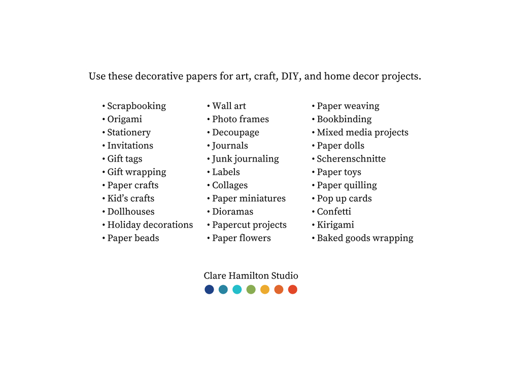 These 6 high definition 12 x 12-inch digital images are ready to be downloaded and used for art and craft and home decor projects: scrapbooking, journaling, collaging, origami-making, papercutting, paper miniatures, paper flowers, kids' crafts, paper flowers, paper weaving, paper dolls and houses, paper toys, wall art, paper beads, paper quilling, pop-up cards, stationery, gift tags and gift wrapping, decoupaging, bookbinding, and enhancing photo albums.