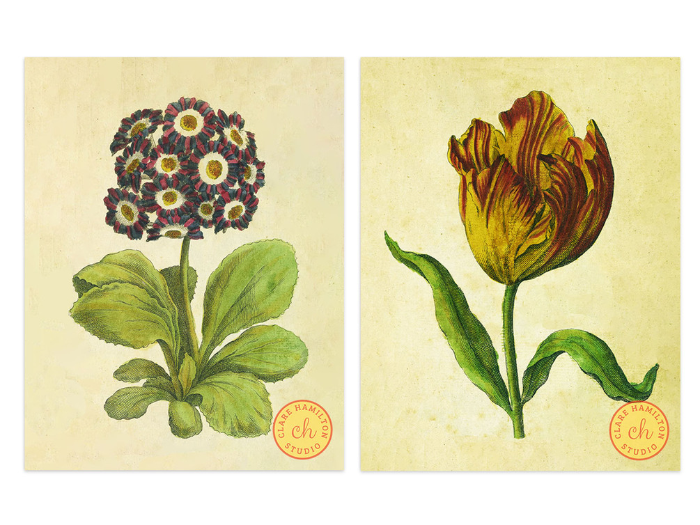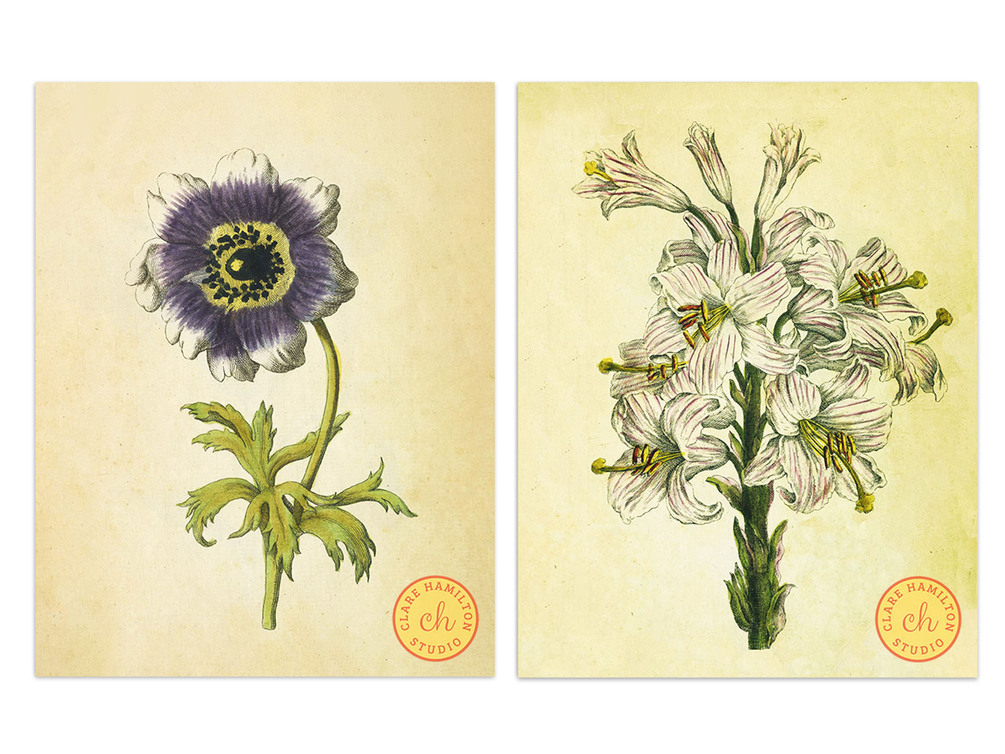 Eight 18th c. botanical illustrations of garden flowers edited and enhanced.