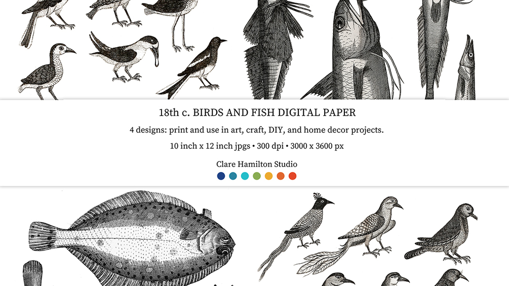 Four hi-def 10 x 12-inch enhanced and edited 18th c. illustrations of birds and fishes, ready to download and use in personal art and craft, DIY, and home decor projects.