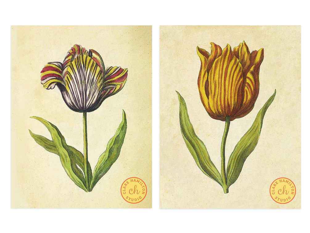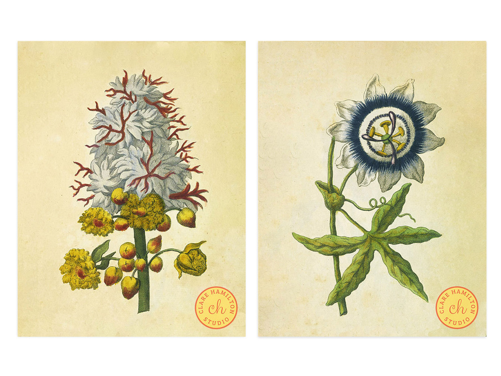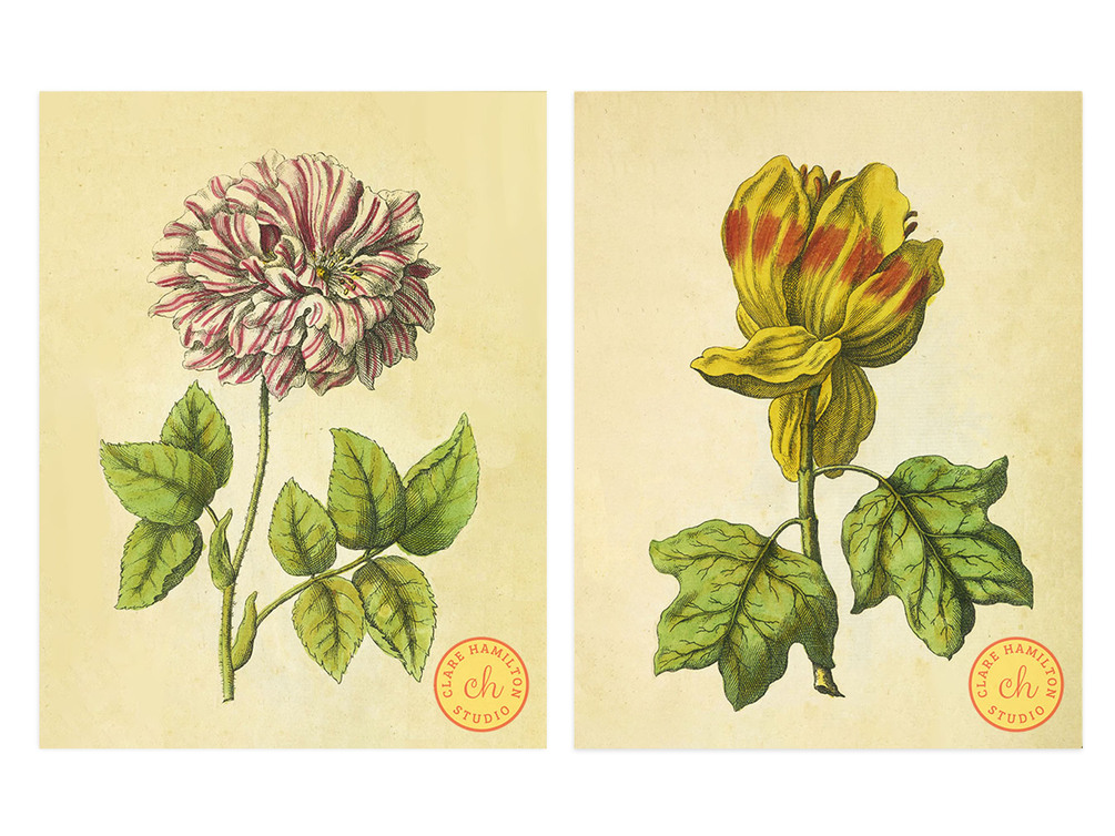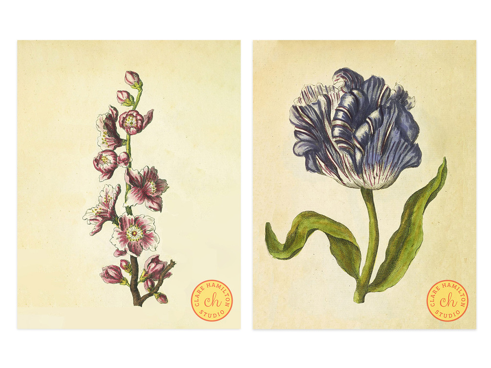 Eight 18th c. botanical illustrations of garden flowers edited and enhanced.