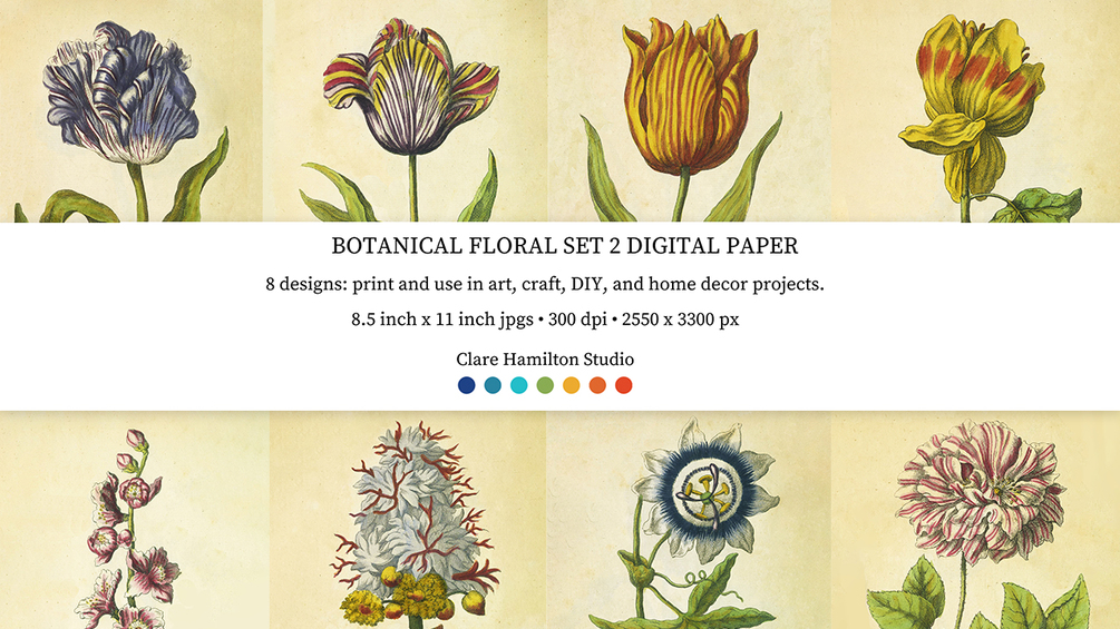 Hi-resolution botanical-themed 8.5 x 11-inch digital papers in jpg format for art and craft projects: