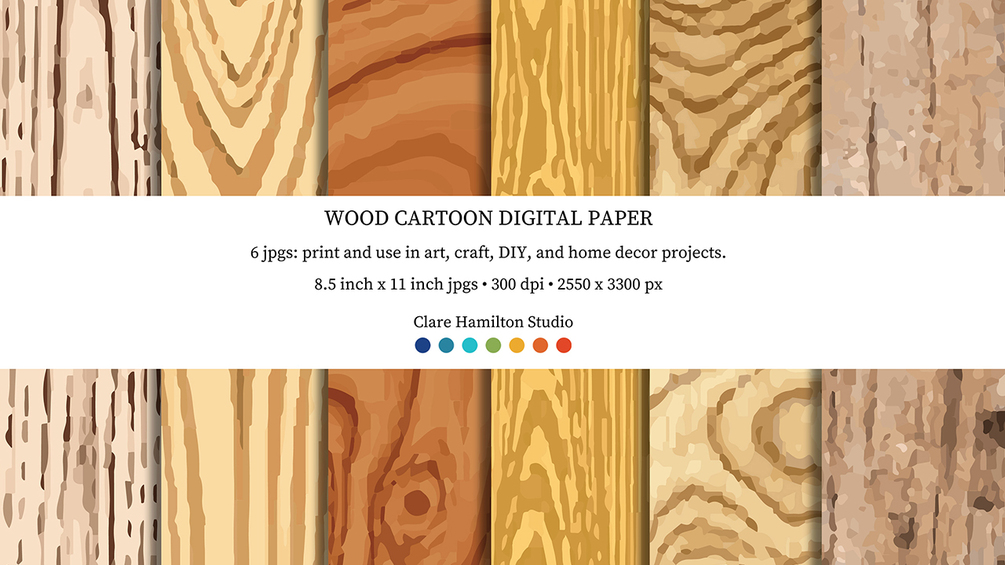 6 hi-def 8.5 x 11-inch cartoony wood illustrations ready to download and use in personal art and craft, DIY, and home decor projects.